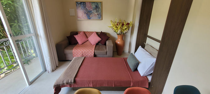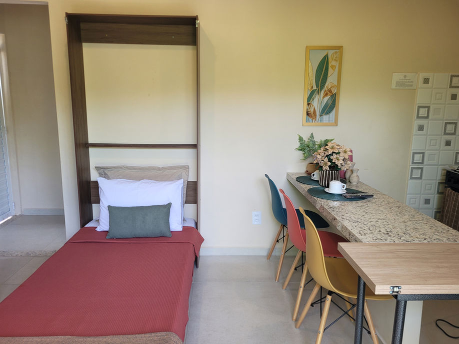 A sala de estar conjugada com a cozinha integra conforto e funcionalidade em um único ambiente. O espaço foi pensado para oferecer praticidade no dia a dia, permitindo que as atividades da rotina — cozinhar, relaxar ou trabalhar — aconteçam de forma fluida e acolhedora. A área da cozinha é compacta, porém bem equipada, com bancadas funcionais que facilitam o preparo das refeições e dialogam visualmente com a sala. Já a sala de estar conta com mobiliário confortável e bem distribuído, favorecendo a convivência e criando uma atmosfera agradável. A integração entre os dois ambientes amplia a sensação de espaço e proporciona um ambiente moderno, luminoso e versátil. A sala destes apartamentos contam com uma cama de solteiro articulável que, durante o dia, funciona como uma estante prática e funcional, e à noite se transforma em uma confortável cama de solteiro, trazendo mais praticidade e amplitude ao ambiente